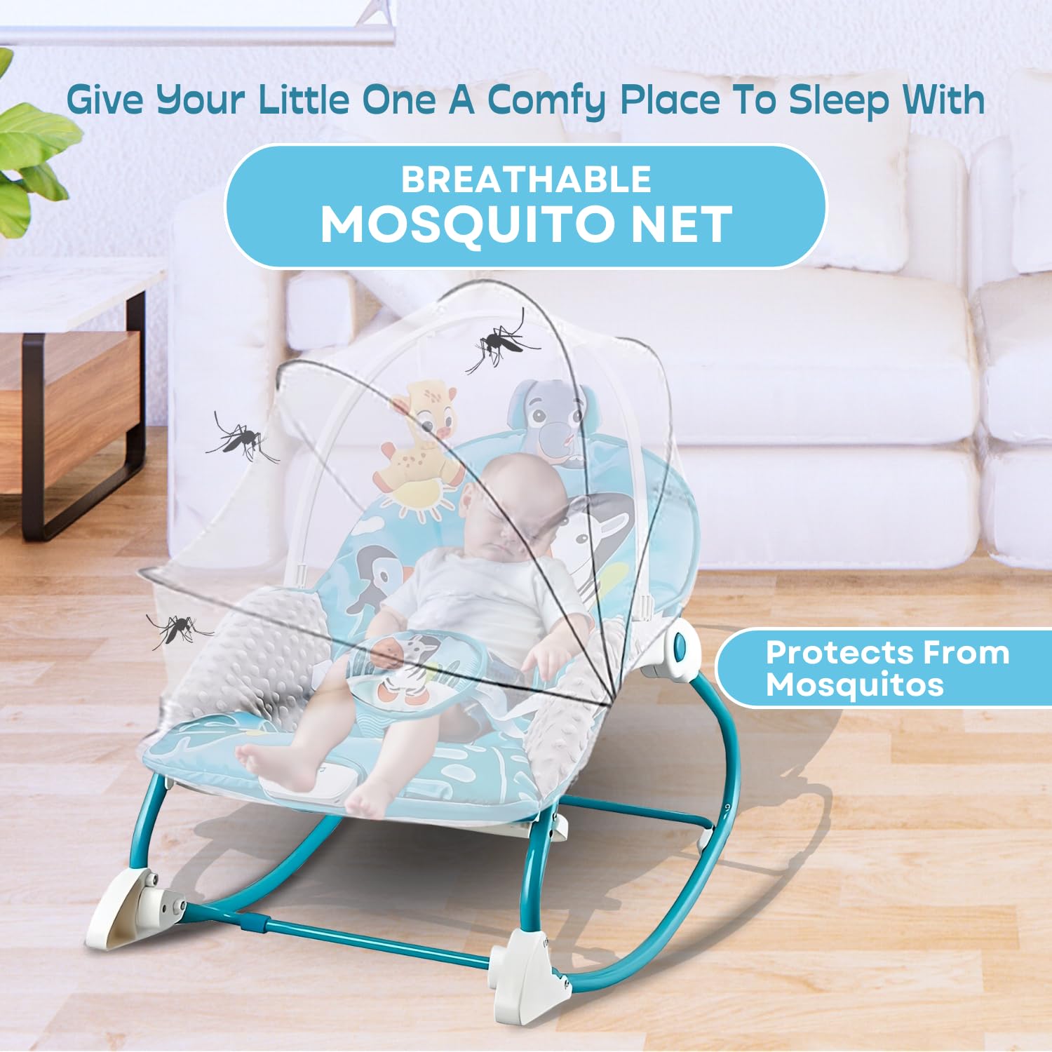Compact and Portable Design: The baby swing rocker features a lightweight and compact build, making it easy to store and transport. It includes a toy bar with two engaging toys to stimulate your baby’s senses, a convenient tray for feeding, and a mosquito net to protect your little one from insects, ensuring both comfort and safety. Perfect for use at home or while traveling, this swing rocker provides convenience without compromising on essential features.