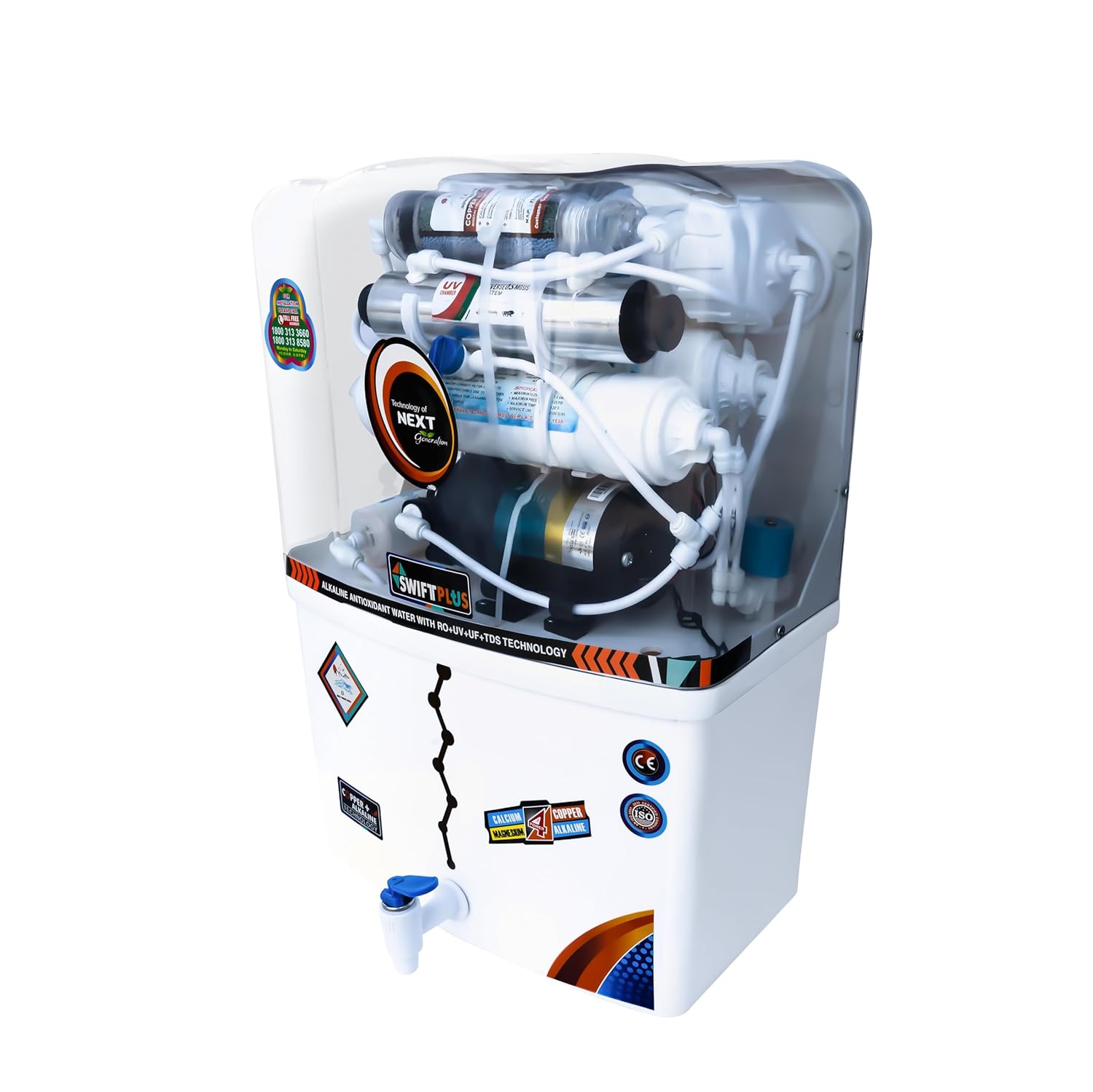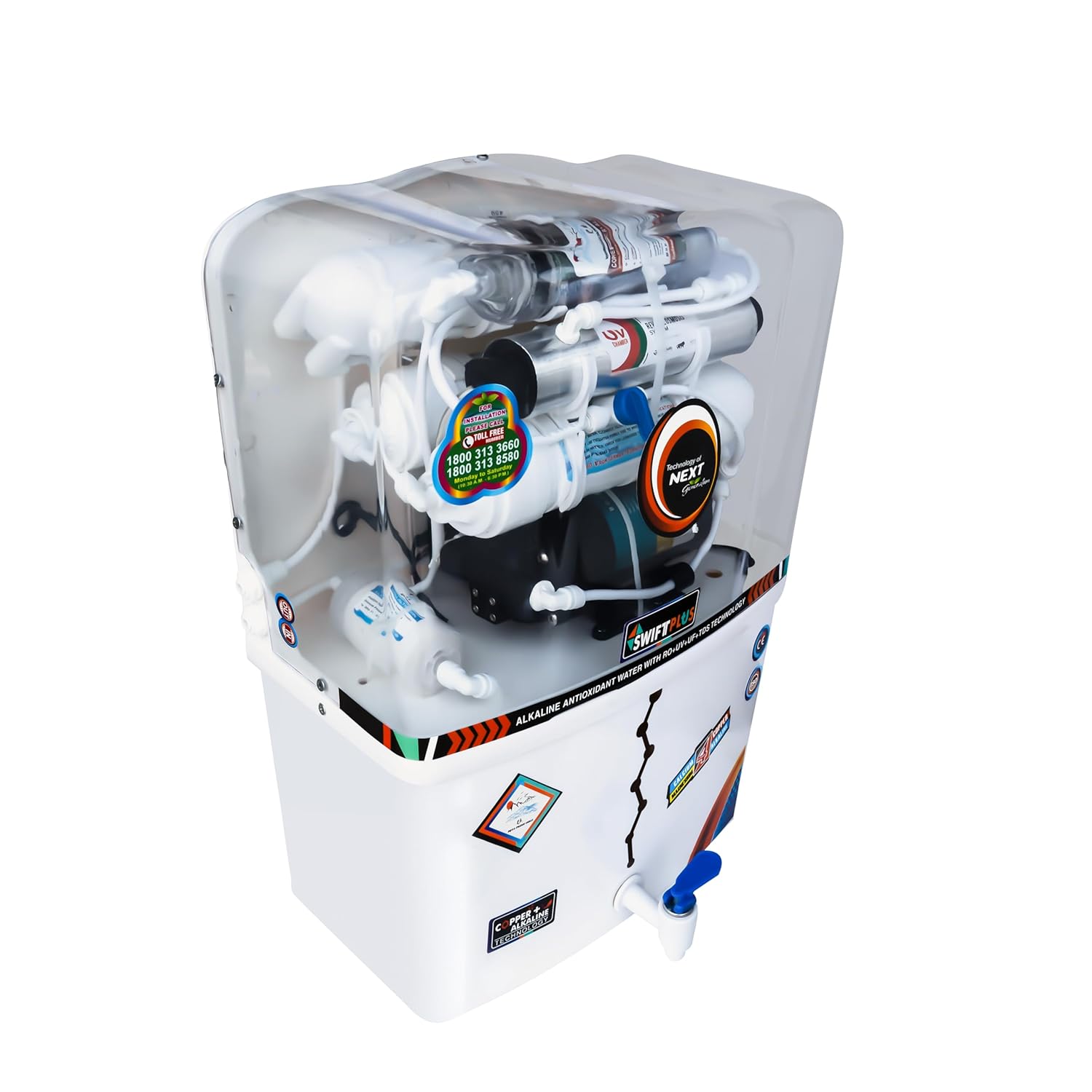 TDS Control:Allows users to adjust the Total Dissolved Solids (TDS) level, ensuring water retains essential minerals while removing impurities. Copper-Enriched Water:Integrated ORC copper technology infuses water with copper ions, known for their health benefits, including improved digestion and immunity. High Capacity:15 LPH (liters per hour) purification rate, ideal for both home and office use. Automatic Operation:Fully automatic with auto shut-off and auto start features, ensuring convenience and energy efficiency. Compact Design:Modern and space-saving design suitable for kitchen or office interiors.