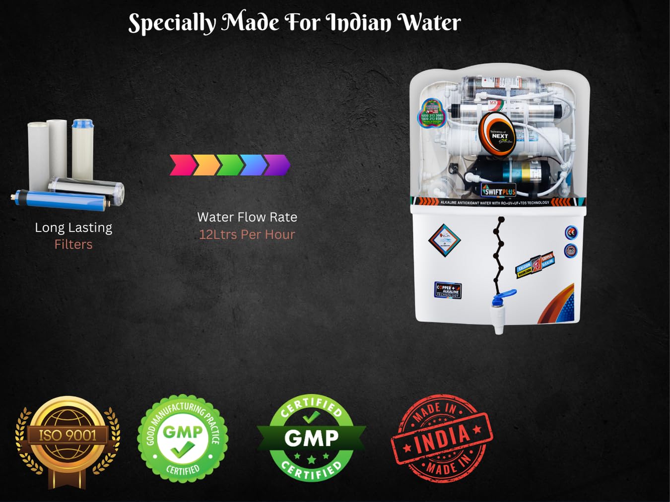 Multiple purification by RO+UV+UF+Copper+ TDS Control which removes even dissolved impurities such as arsenic, rust, pesticides & fluorides, and kills bacteria and viruses to make water pure and suitable for drinking with goodness of Minerals